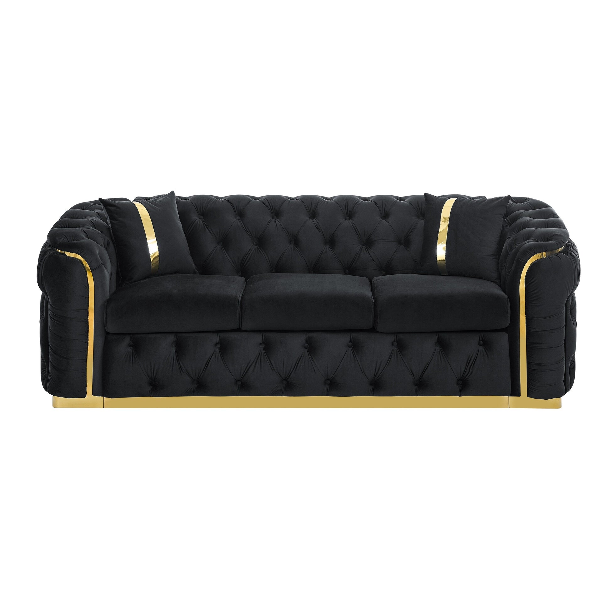 Divano 3 posti in velluto 90.6 con 2 cuscini, imbottitura ad alta densità, dettagli dorati e cuscini.