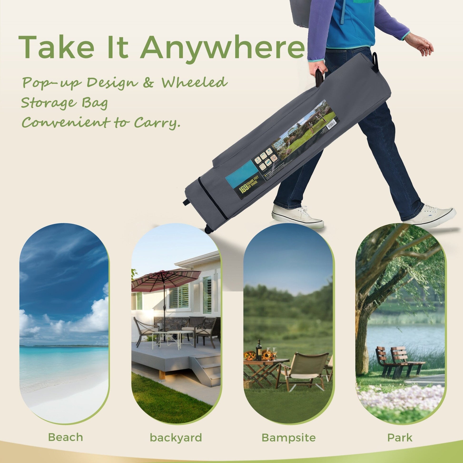 【Accessorio】 : È inclusa una borsa con ruote per facilitare il trasporto e lo stoccaggio. Ricordarsi di stabilizzare la tettoia con i cordoni e i picchetti inclusi.