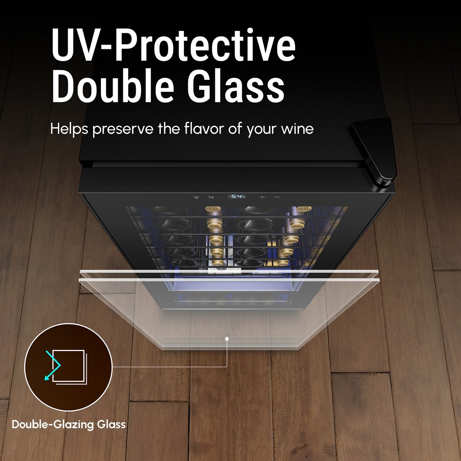 - Preserva la qualità del tuo vino con la nostra porta in vetro a doppio vetro con protezione UV. Questa caratteristica blocca i dannosi raggi UV, garantendo che il tuo vino mantenga il suo gusto e aroma perfetti.