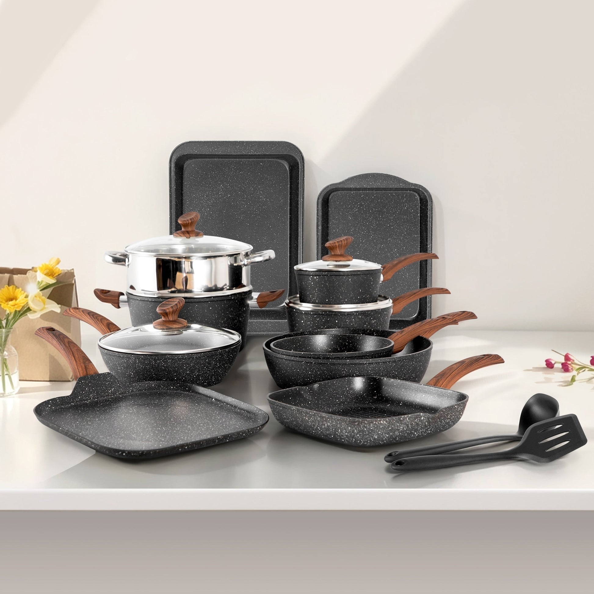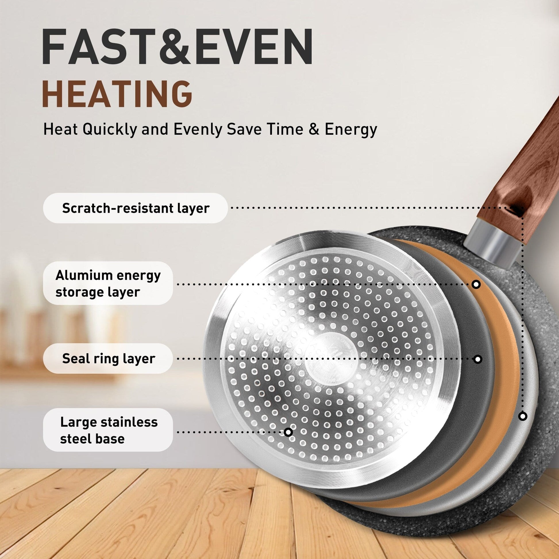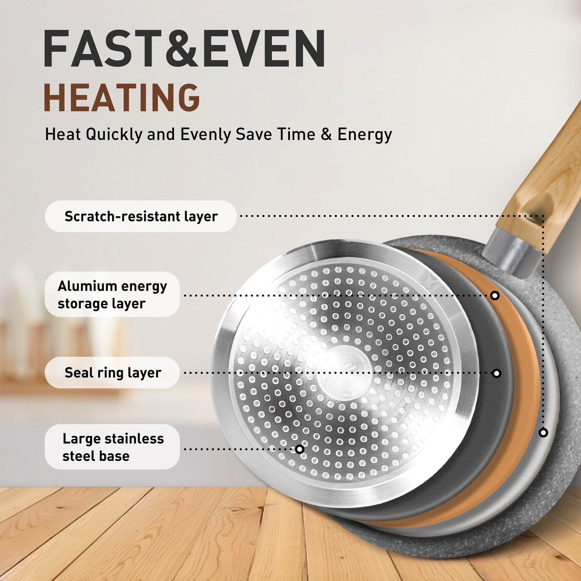 Pentolame per cucina ad induzione: all'interno, questa pentolame utilizza un nucleo in alluminio. Il risultato è che la pentola si riscalda rapidamente e, cosa più importante, distribuisce il calore in modo uniforme. Il set di pentolame è compatibile con tutti i principali tipi di piano cottura. Una base in acciaio inossidabile più ampia e ad alta conducibilità magnetica garantisce la compatibilità con induzione, gas, elettrico e soprattutto con piani cottura in vetro.