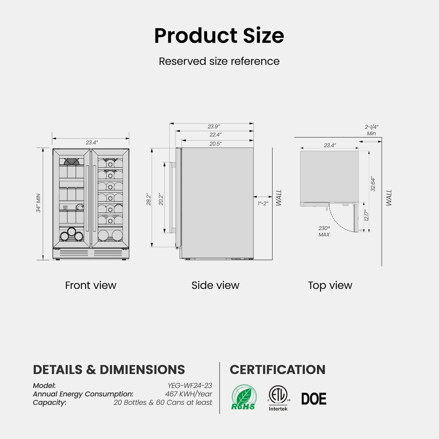 Ampia Capacità: Con una capacità di 20 bottiglie standard di Bordeaux da 750 ml e fino a 60 lattine di bevande da 12 once, il frigorifero per vino e bevande Yeego soddisfa tutte le esigenze di intrattenimento. Il lato destro del refrigeratore è dotato di sei ripiani in legno rimovibili per il vino, mentre il lato sinistro offre 3 ripiani a filo regolabili per le bevande, fornendo una soluzione flessibile per la conservazione di vino e bevande di diverse dimensioni di bottiglie e lattine.