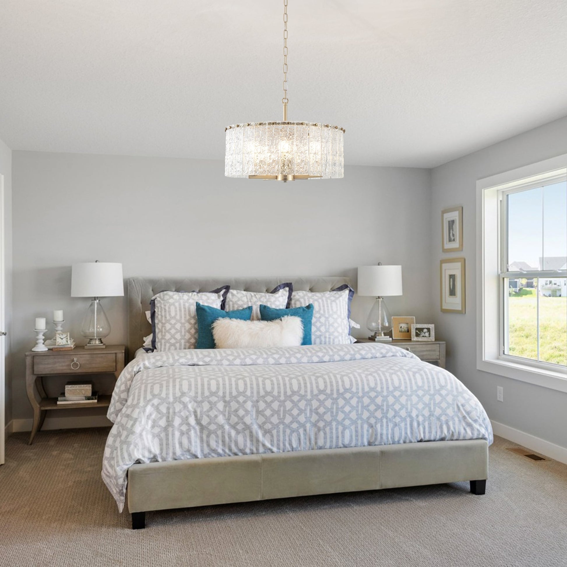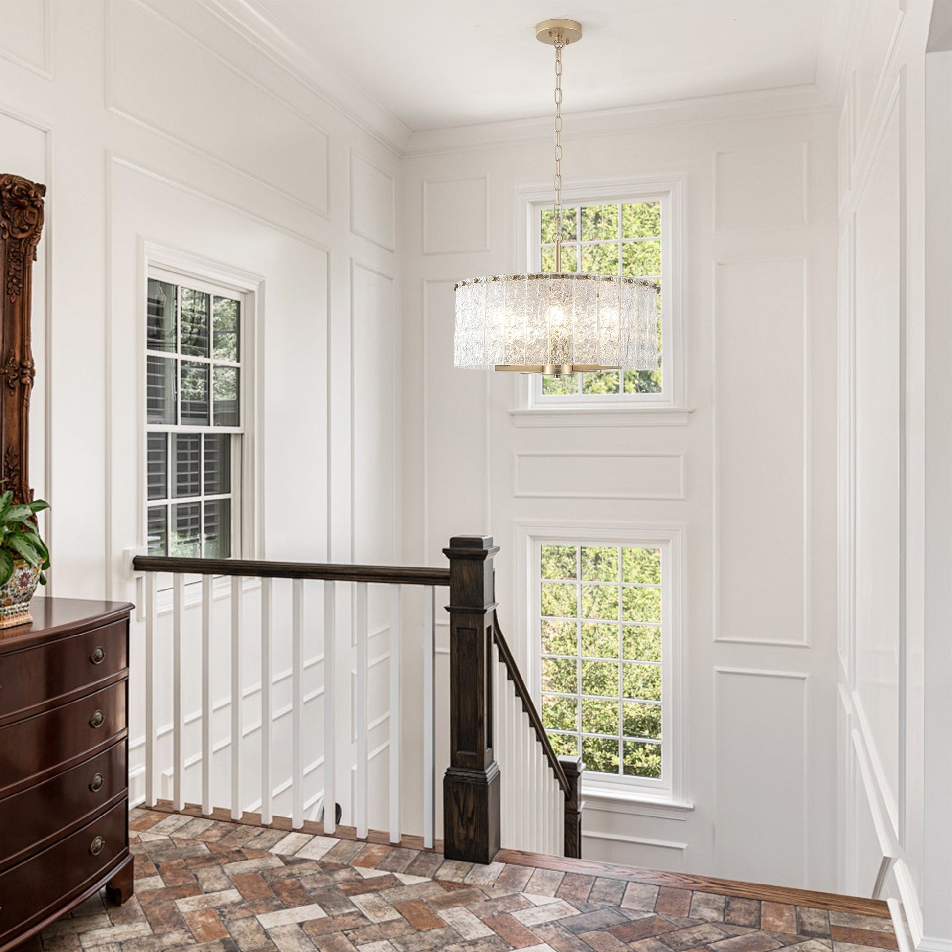 Illumina il tuo isola cucina con eleganza utilizzando la nostra lampada a sospensione a forma di tamburo.  Caratterizzata da un design straordinario con dettagli in cristallo, questa lampada esprime raffinatezza e lusso. Con cinque luci e una direzione luminosa verso l'alto, fornisce un'illuminazione abbondante aggiungendo un tocco di glamour al tuo spazio. Realizzata con metallo, vetro e vero cristallo cinese K9 di alta qualità, garantisce durata ed estetica lussuosa. La lunghezza regolabile consente un posizionamento flessibile, mentre la compatibilità con i soffitti inclinati offre opzioni di installazione versatili. Perfetta per ambienti asciutti, questa lampada a sospensione combina stile e funzionalità per migliorare l'atmosfera di qualsiasi cucina. Nota: le lampadine non sono incluse.