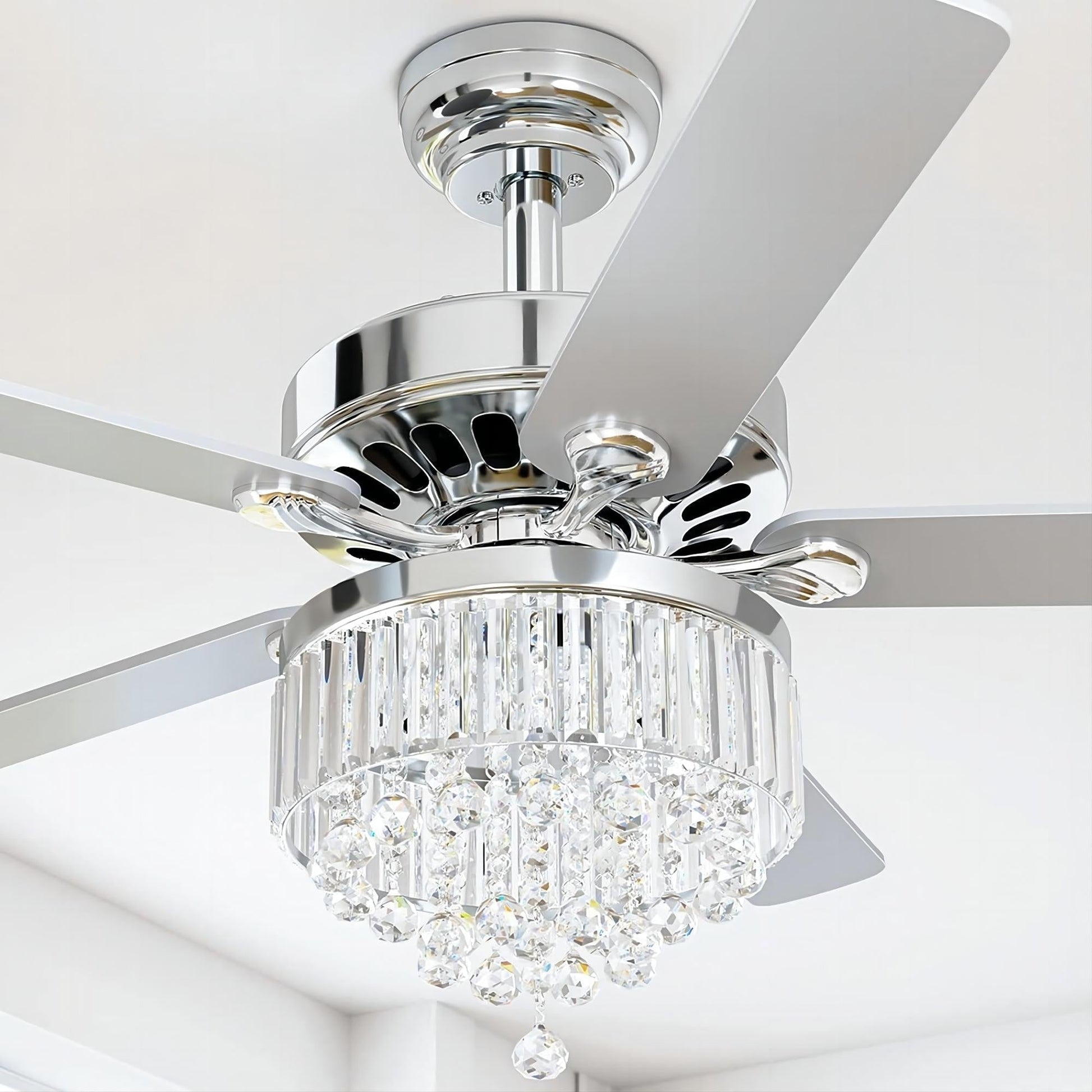 Eleva la tua casa con l'esquisito fascino del nostro lampadario a soffitto con ventola a 5 pale in legno da 52 pollici e cristalli. Combinando l'eleganza dei cristalli con le pale in legno color argento, questo capolavoro moderno valorizza senza sforzo qualsiasi ambiente. Rimani comodamente fresco grazie al motore a tre velocità e all'impressionante flusso d'aria, godendoti al contempo i vantaggi di un prodotto efficiente dal punto di vista energetico. Completo di un comodo telecomando, regola senza fatica la velocità della ventola e l'illuminazione per creare l'atmosfera perfetta per ogni occasione. Aggiungi un tocco di maestosità al tuo spazio con questo straordinario lampadario a soffitto con ventola.
