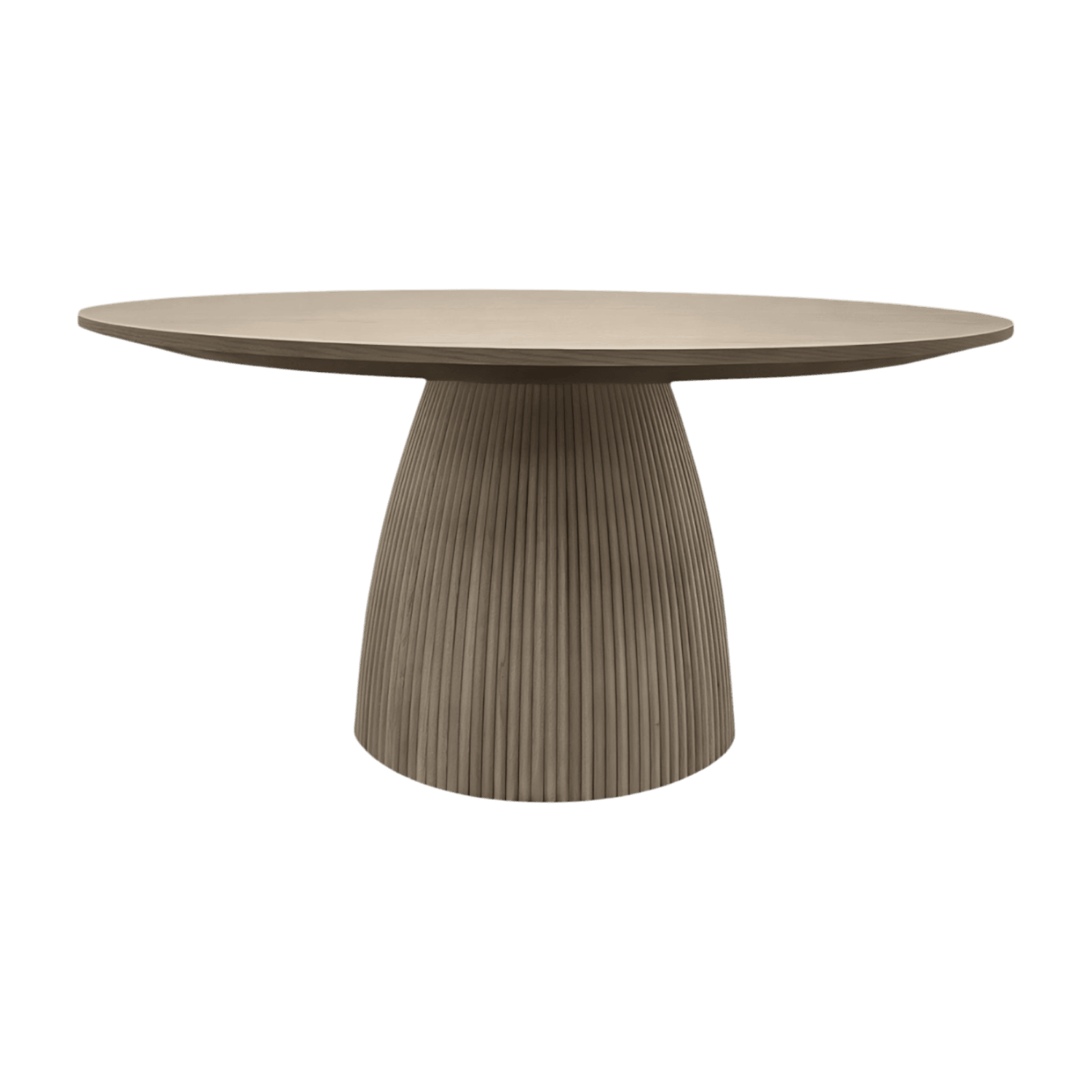 La caratteristica distintiva di questo tavolo è il design della base, che presenta un'accattivante disposizione di listelli verticali in legno che aggiungono profondità e consistenza all'estetica complessiva. La combinazione tra il piano pulito e rotondo e la base artistica crea un'armoniosa fusione di elementi di design moderni e classici, rendendo il tavolo da pranzo Oxford in rovere greige una scelta elegante e funzionale per la vostra casa.