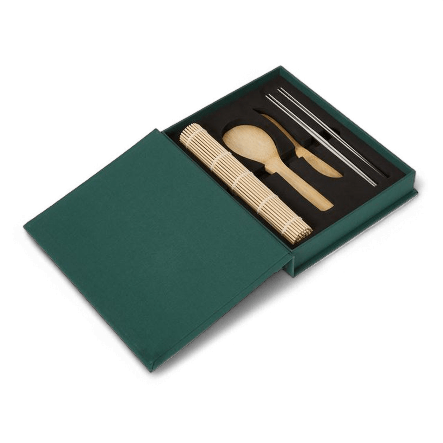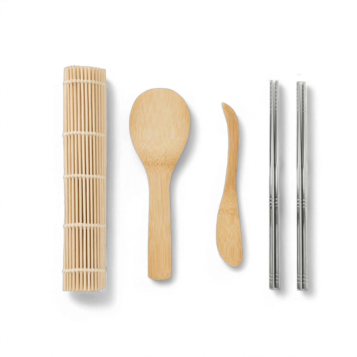 Incluso in questo kit: 1 pagaia in bambù, 1 coltello in bambù per spalmare, 1 tappetino in bambù per arrotolare, 8 bacchette