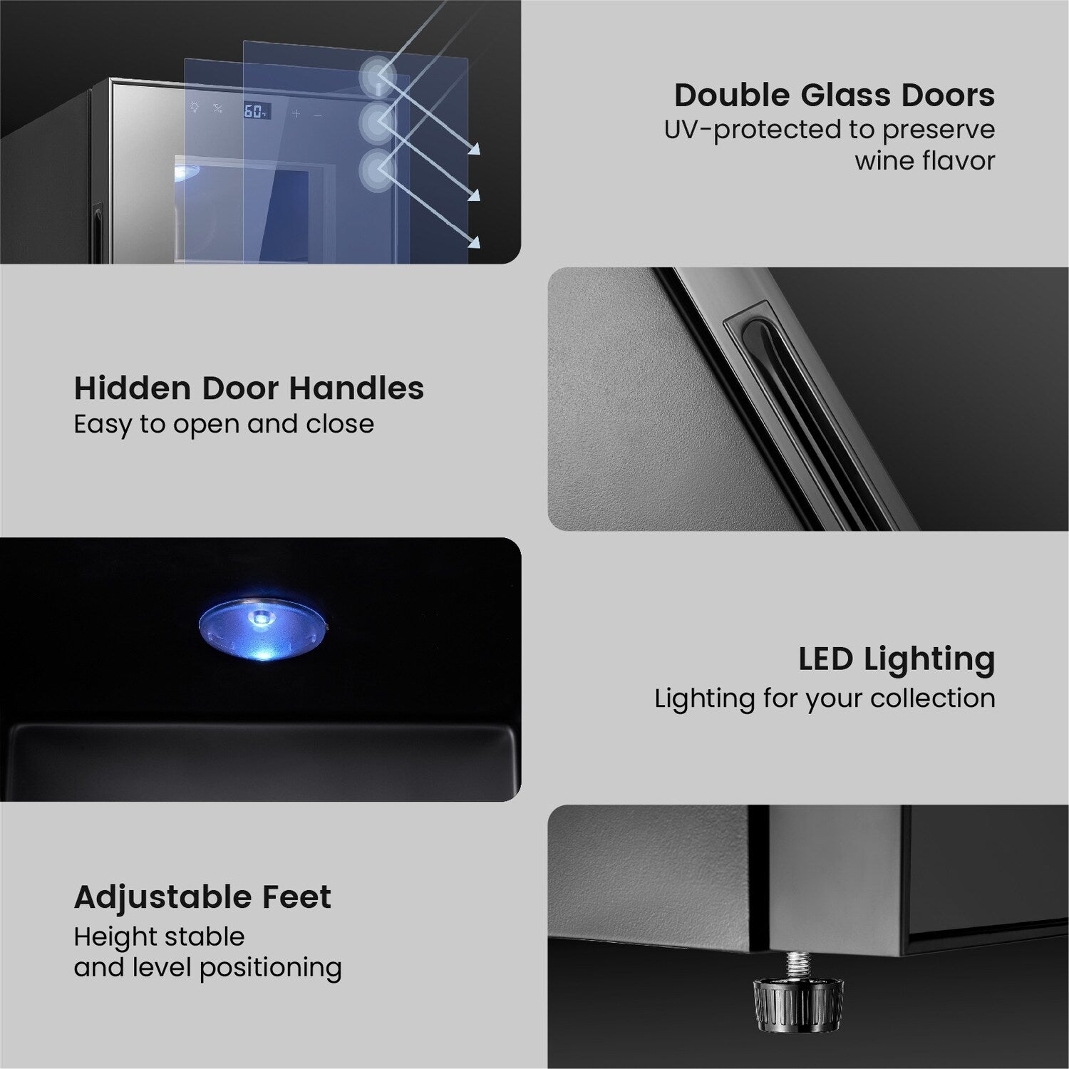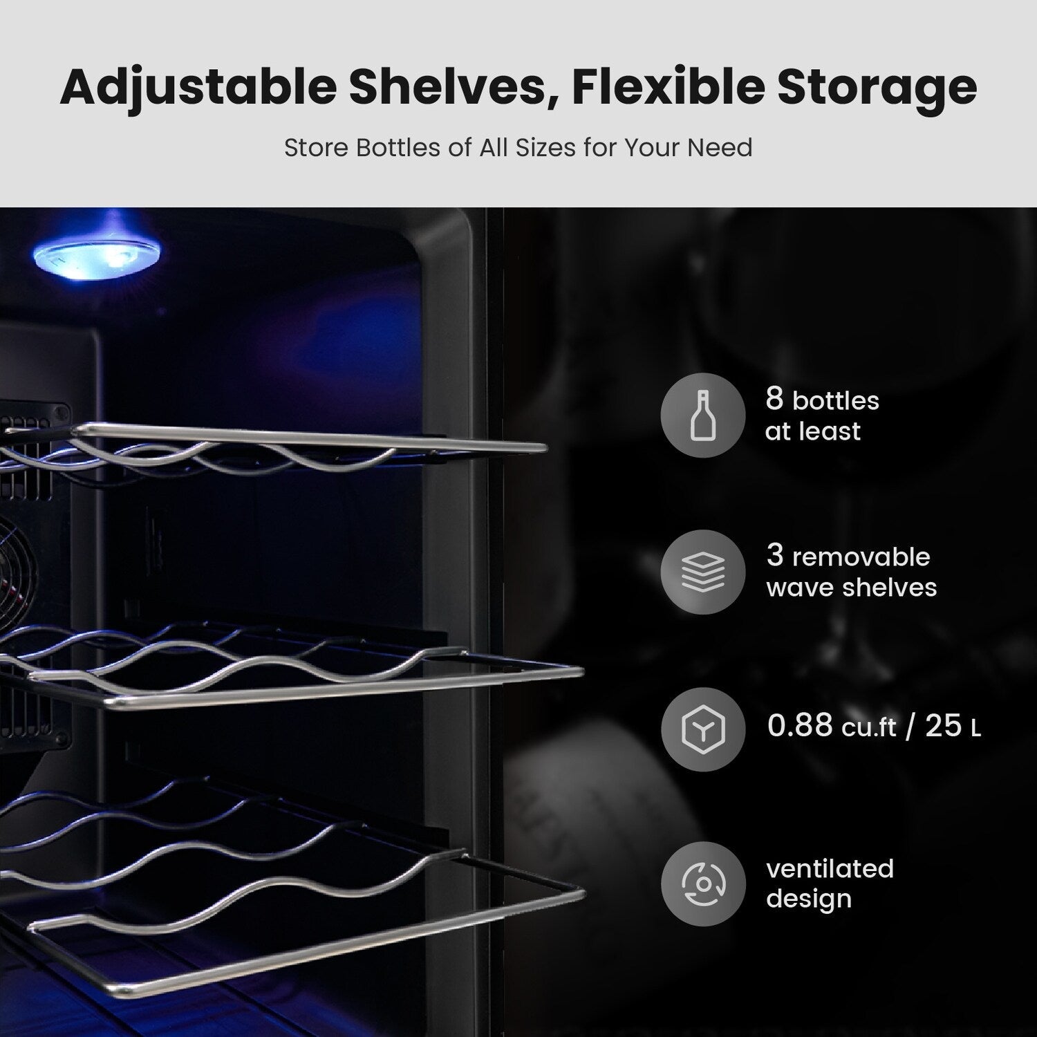 Spazio di conservazione versatile: può contenere 8 bottiglie di Bordeaux standard da 750 ml con tre mensole rimovibili, consentendo flessibilità per diverse dimensioni e tipi di bottiglie.